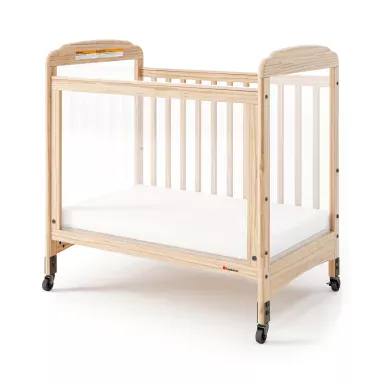 The SafetyCraft Fixed-Side Compact Crib ensures that you do not have to sacrifice safety for affordability. High quality construction includes advanced strength fasteners, mortise and tenon joinery, and a solid steel box frame crib mattress board that adjusts 2 heights. Offering incredible value for home and daycare settings, the SafetyCraft portable crib comes in a natural wood finish and features a plastic teething rail for protection and longevity of the crib. A InfaPure ultra-durable foam mattress and non-marking ultra-quiet casters (two locking) are included. Available with Clearview or Slatted end panels.