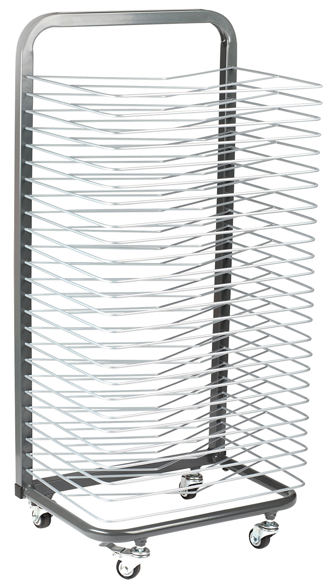 The Drying Shelf has 25 layers and holds 25 sheets in DIN A3 format or 50 sheets in DIN A4 format. Due to four practical wheels, two of which are lockable, it can be flexibly moved in a room while having a secure stand.