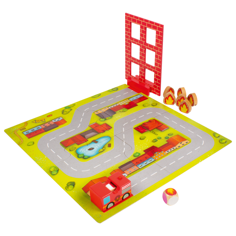 Help – the building is on fire! Fortunately, all of the animals and people could be brought to safety, but can the building be saved? The firefighters have jumped into the fire engine and are on their way to the scene of the fire. Hopefully they will arrive before the building burns down!