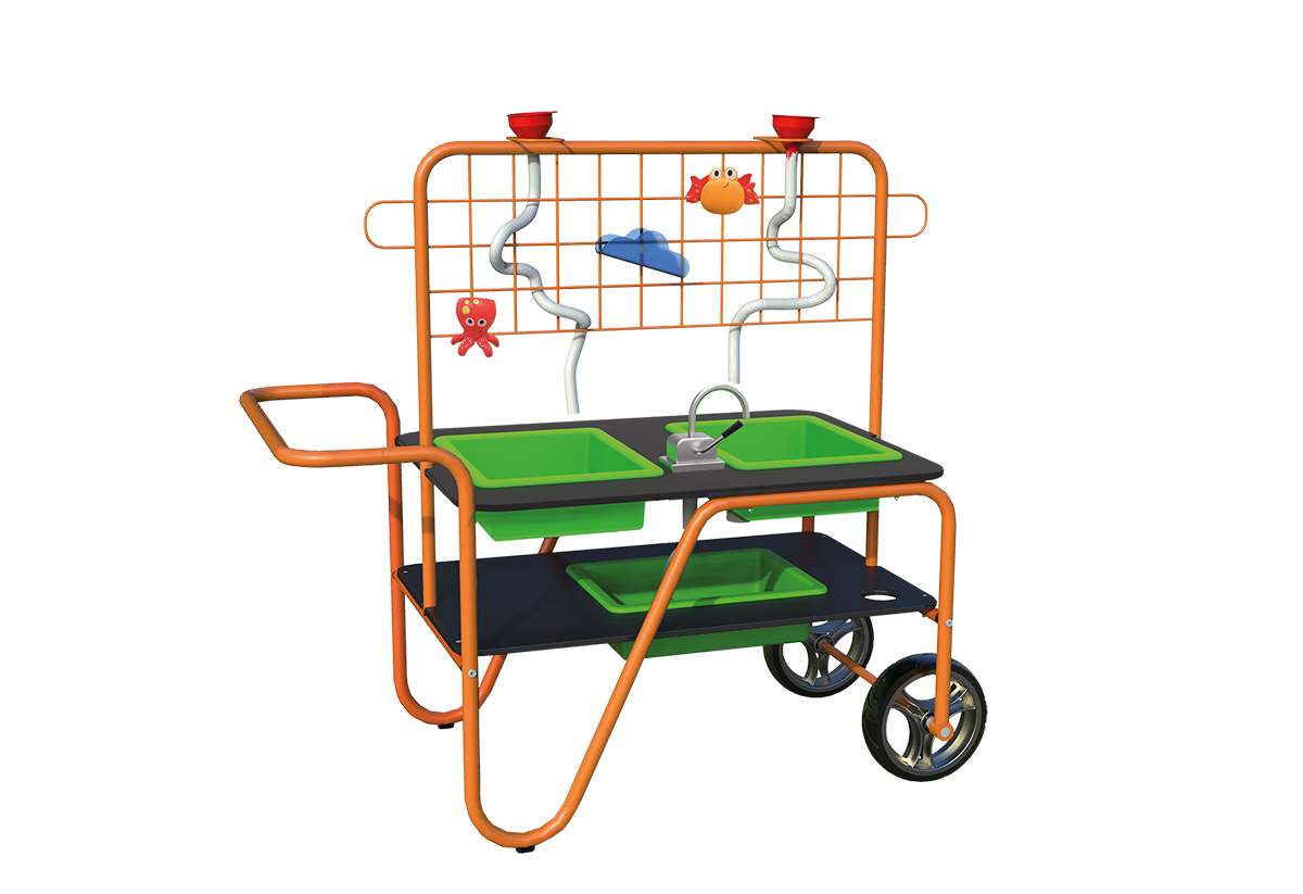 The beleduc water-table offers many possibilities for outdoor roleplay and a first contact with science. Children love to play and experiment with water, sand and pebbles and observe how they behave in different situations. They can for example find out how water changes directions when they redirect its flow. The children can interact easily due to the transparent design which offers a great possibility for group roleplay. The water-table can be easily moved to different places due to its practical wheels.