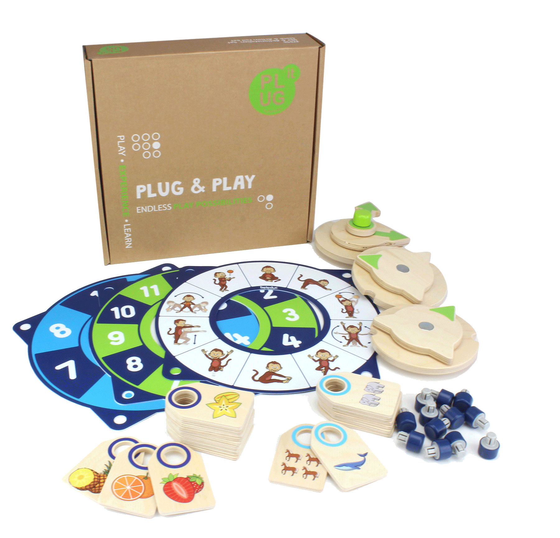 With the PLUG it “Clock & Action Foil Set”, there are no less than five play options on the PLUG it wall and playhouse: two memo games with fruits and animals, a movement game for gymnastics and yoga exercises for the whole group, a communication game about our emotions and a clock with a wooden hand for structuring the day for the first time. The highlight: two games can always be played at the same time because there are two wooden turntables.