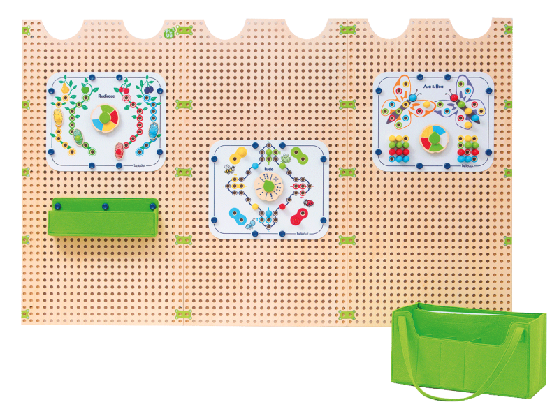 With the integrated games set with the classics Ludo, Rudirace and Ava&Bea, you can start playing immediately!Here, both one child alone can keep busy and make creative patterns or solve tasks, and a whole group can interact with each other. The classic games move away from the table to the wall level. A turning wheel replaces the cube. The special feature: each child can play on it at his or her own height. Nothing has to be put away any more! Further play ideas for the wall system set: gallery for children’s pictures, Orga wall for living democracy with children, sorting wall for painting materials, …